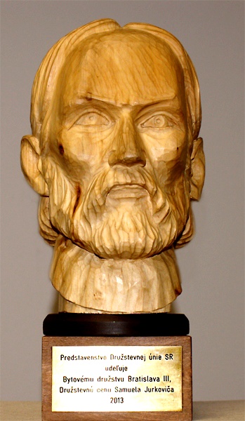Cena je Pamätný list a drevená busta Samuela Jurkoviča v prírodnej farbe na podstavci so štítkom zlatej farby s vyrytým menom BDBA III.